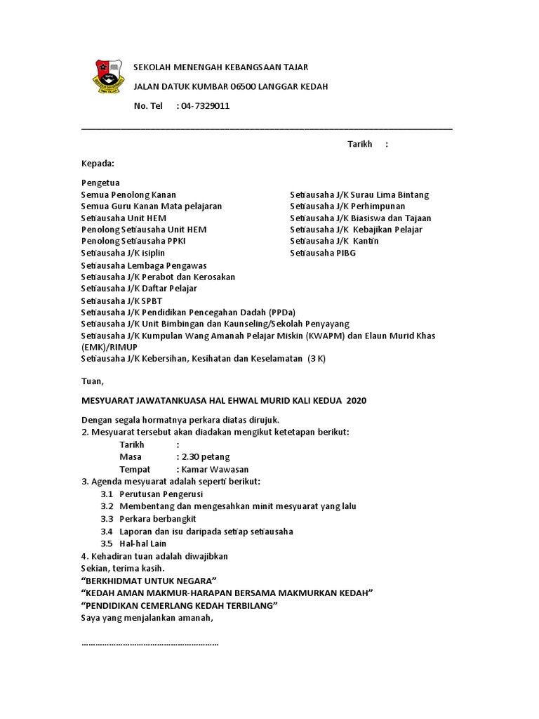 Notis mesyuarat agung pibg smk raja permaisuri bainun kali. Surat 03 Surat Jemputan Mesyuarat Ajk Kali Kedua Pdf Save Save CONTOH SURAT. Contoh format surat panggilan mesyuarat.